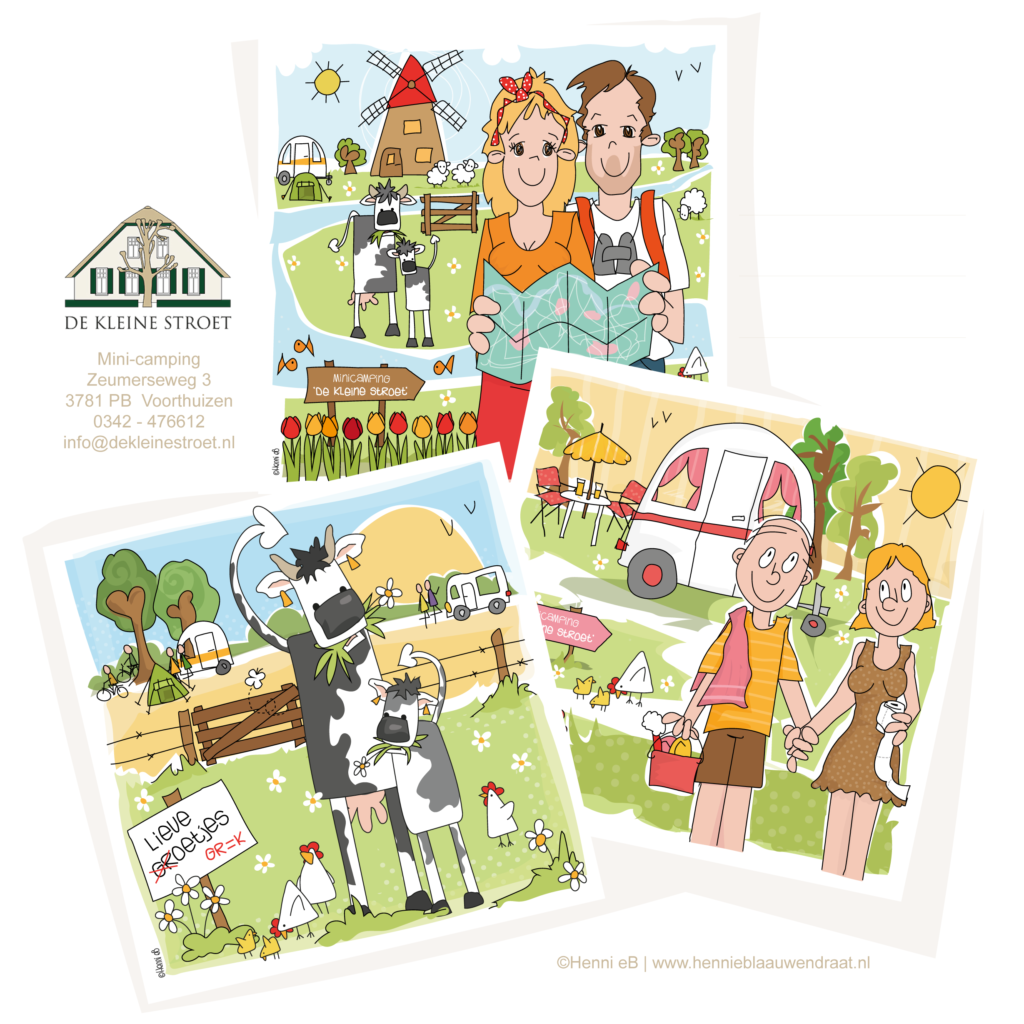 Minicamping ‘De Kleine Stroet’ in Voorthuizen wilde heel graag Wenskaarten voor de gasten. Een kaartje om naar huis te sturen, vrienden, de oppas of gewoon als hart onder de riem. Centraal voor het thema wilde ze graag de campinggast en kalfjes.