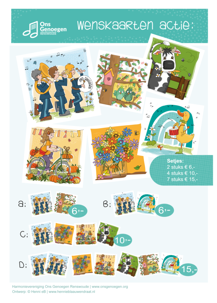 Harmonie vereniging Ons Genoegen heeft extra financiële middelen nodig en wilde dit keer een kaartenactie op touw zetten. Natuurlijk wil ik illustraties ontwerpen/ ter beschikking stellen! Voor wat hoort wat! Ons Genoegen speelt voor mij altijd een vrolijke noot tijdens evenementen zoals tijdens lampegiet, de aubade en vierdaagse ect. Nu kan ik iets terug doen met kleurrijke illustraties! Wij allemaal blij met deze samenwerking en straks de ontvanger van de kaartjes ook… Win win win situatie dus!
