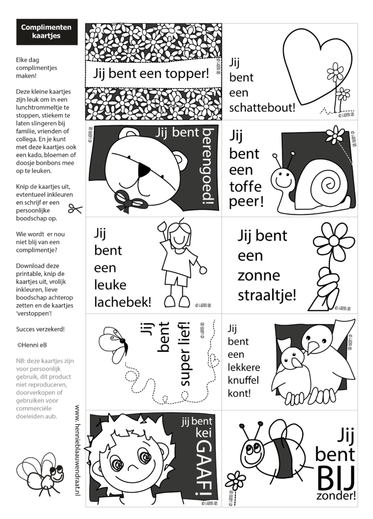 Ook iemand verrassen met een compliment? Download het bestand, print het bestand uit, (kleur de kaartjes) en knip het uit.