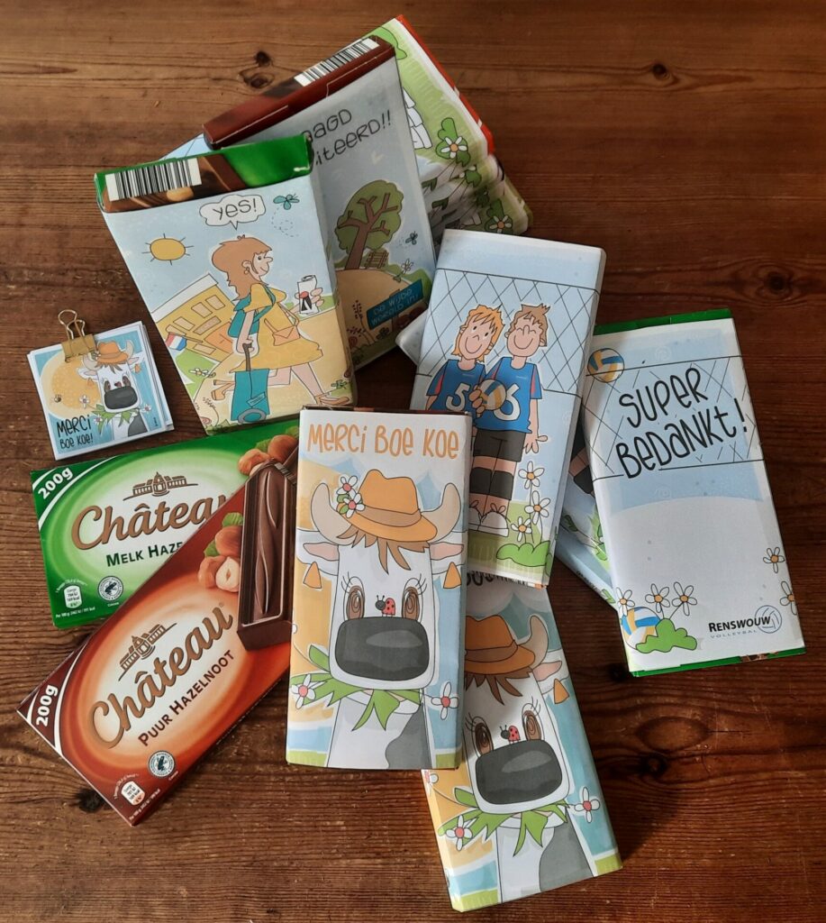 Deze illustratie is een leuk als Wens2appje maar ook als kadolabeltje. De illustratie heb ik 12 keer op a4 gezet, printen, knippen en mijn kadolabel bakje is weer aangevuld. Ook is de illustratie als chocoladewikkel gebruikt, dit is een gezellig kado papiertje om een reep chocolade (200 gr, 9 bij 19 cm) op te leuken.
